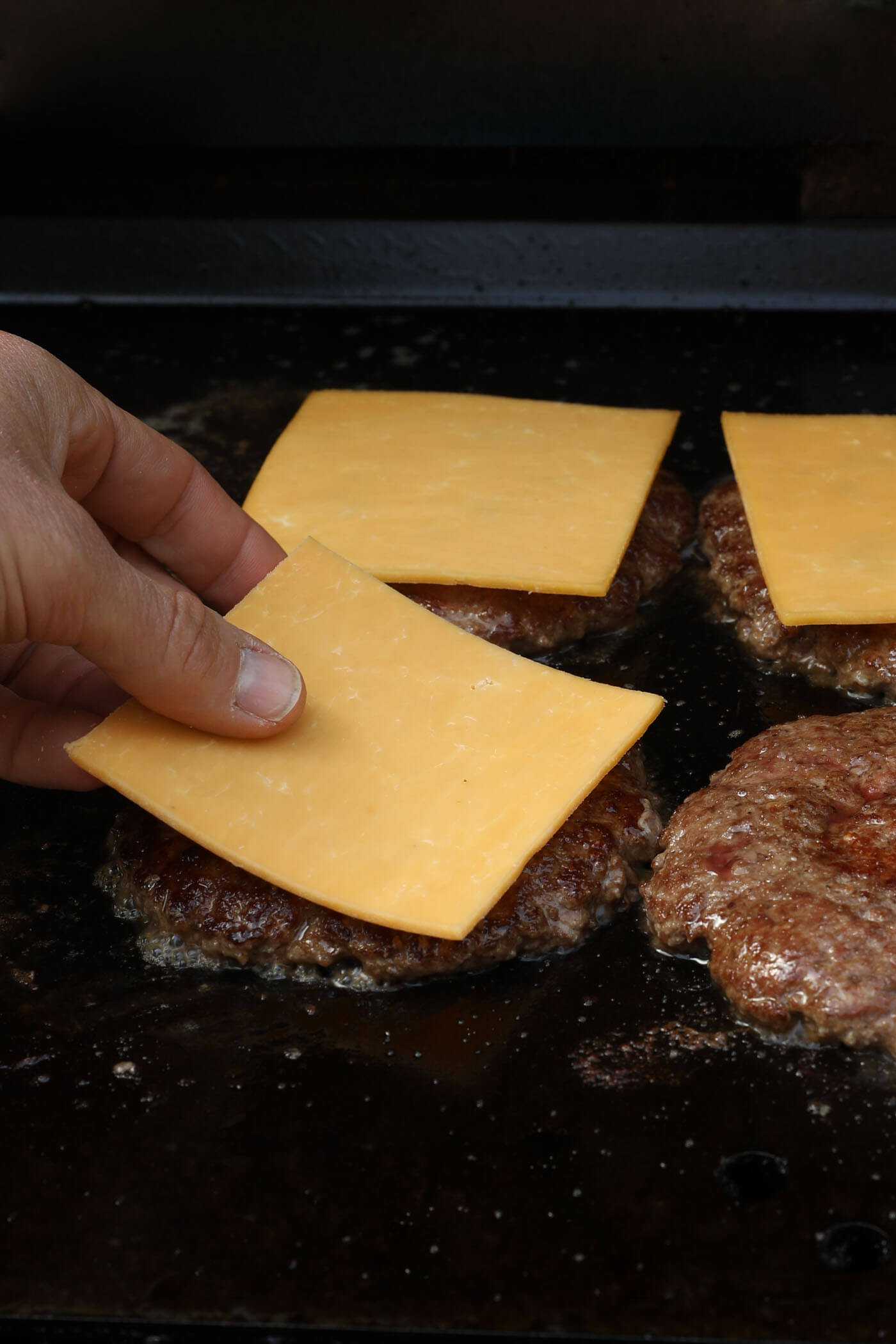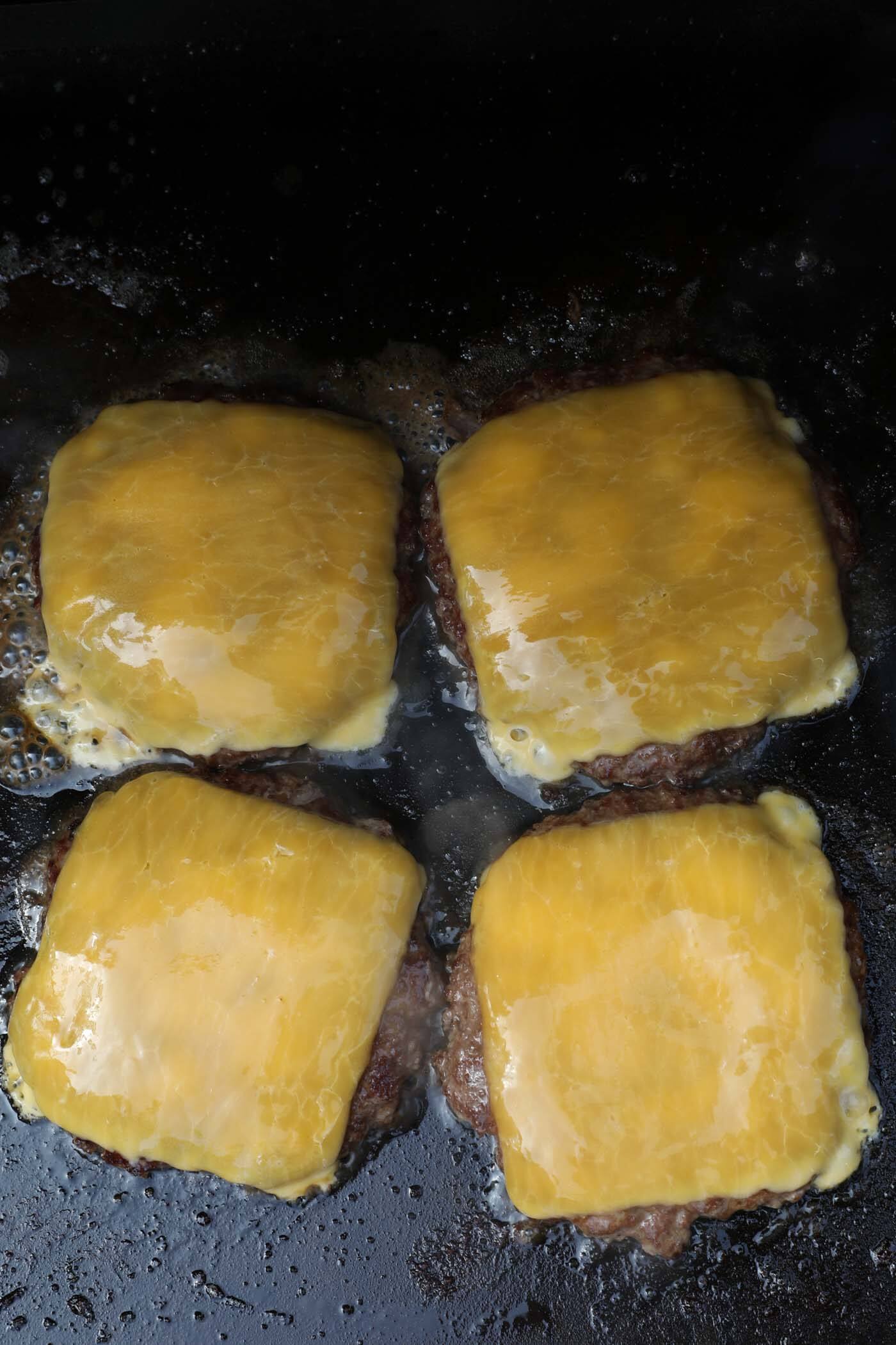 - When the burgers are finished (when the cheese is melted), remove them from the griddle.