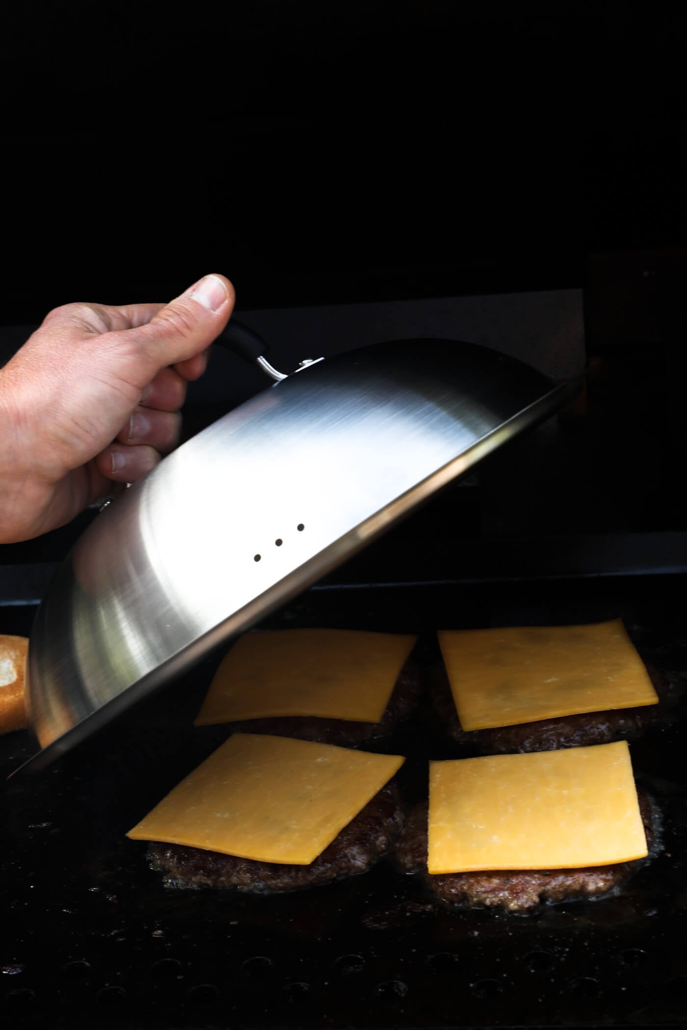 - Melting the cheese – Since smash burgers are so thin and cook quickly, you can easily overcook them by letting the cheese melt for too long. We highly suggest using a large dome lid for melting cheese. We use this cheese melting dome and it’s great because it’s large enough to fit all 4 smash burger patties underneath it to melt the cheese quickly.