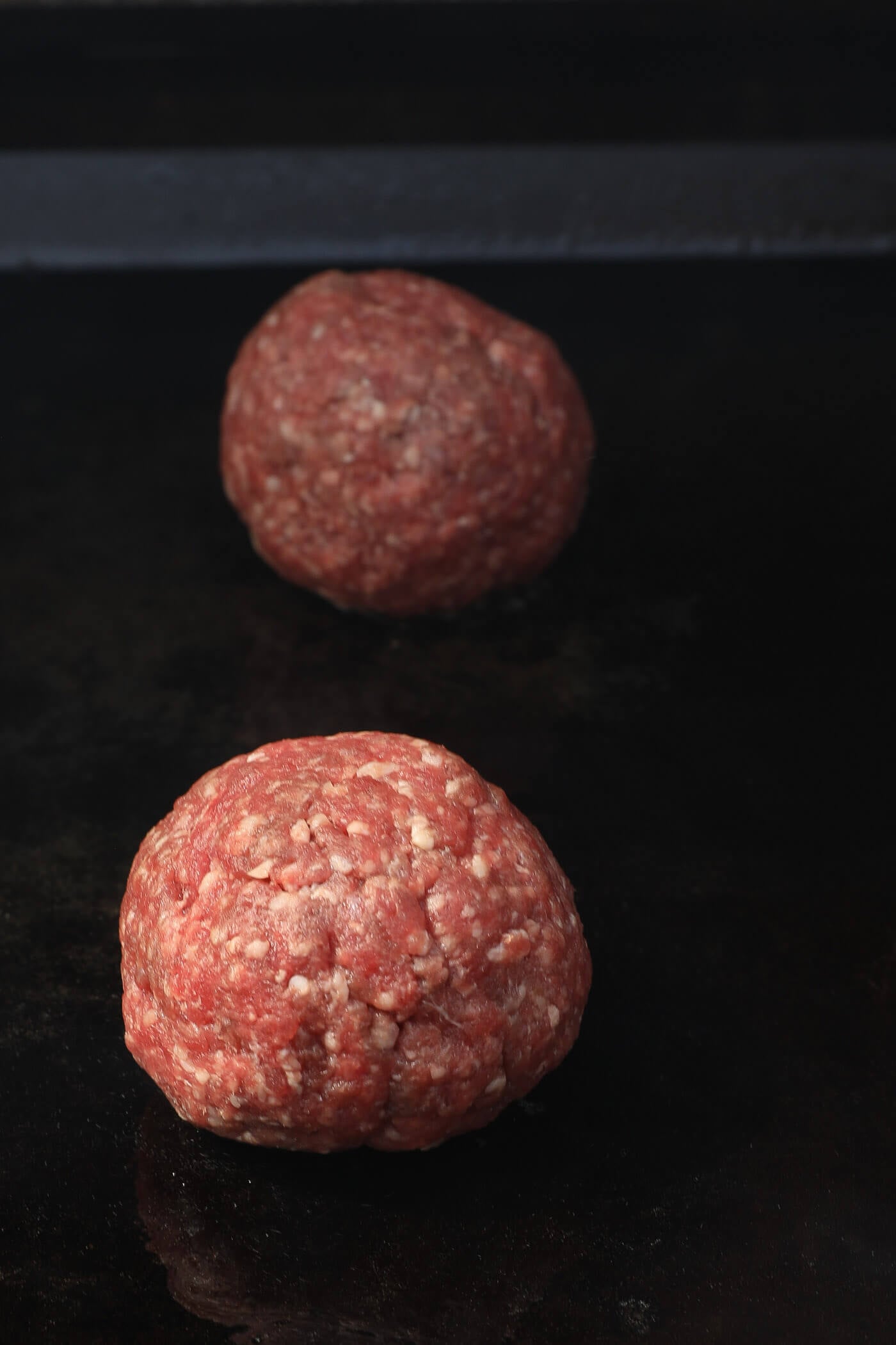 - Place the balls of beef on the griddle, leaving enough space in between each to smash them. Before smashing the burgers, allow them to sear (while still in ball form) for just a minute. After searing the balls, flip the balls of beef over so the seared section is facing up.