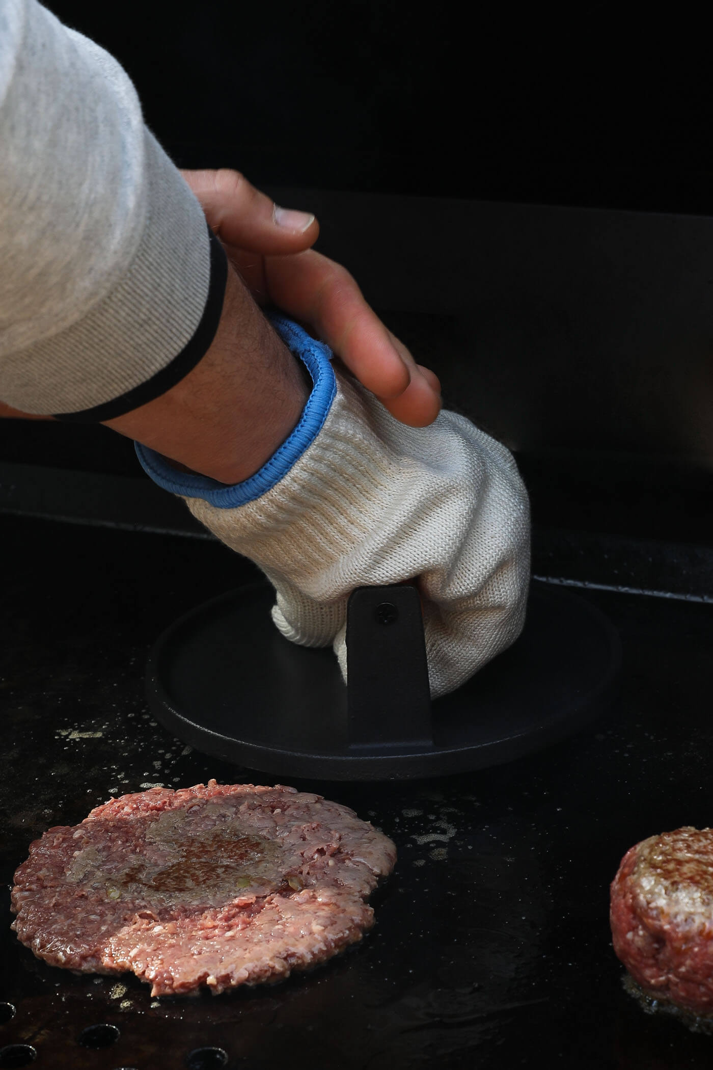- Smashing the burgers – You can use 2 metal spatulas crisscrossed to flatten the burgers. Or you can get a burger press and make your life easier. This heavy duty burger press is the one we use and it’s great.